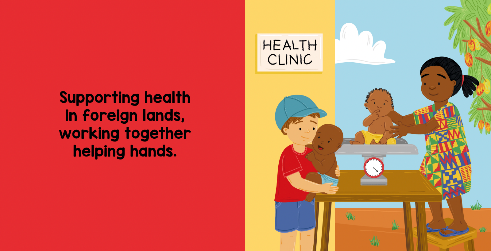The story follows a young boy who imagines himself serving as a Peace Corps Volunteer in Ghana. With curiosity and courage as his guide, he leaves home, embraces a new culture and discovers the joy of making a difference. Along the way, he forms a meaningful friendship with a local girl who helps him navigate life in a new country. Together, they share adventures as he lends a hand at a health clinic, in a school and on a farm.